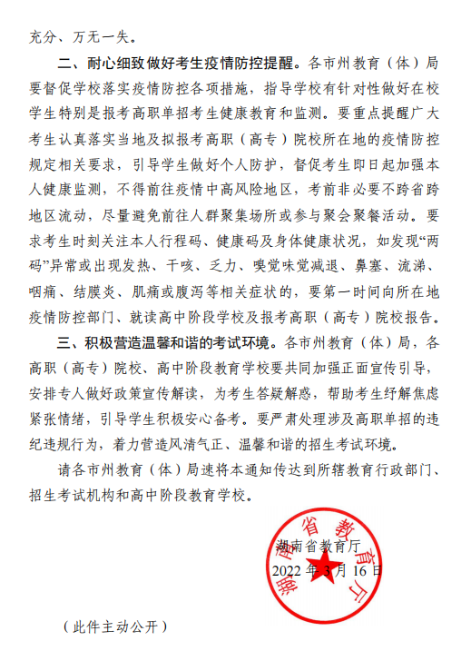 根据湖南省教育厅下发的《关于推迟2022年我省高职(高专)单独考试时间的通知》要求,我院原定于3月18日的单独招生考试向后顺延,具体考试时间根据省教育厅、省考试院等上级部门新的文件要求再另行通知,请已预订车票、住宿的考生做好相应的退票或改签。