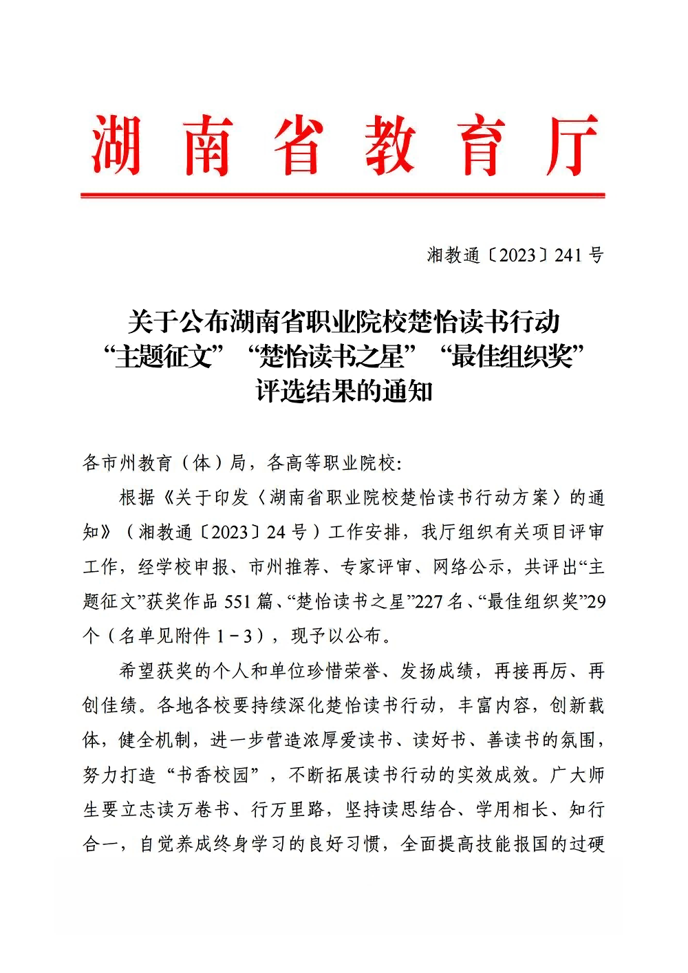 日前,湖南省教育厅公布了2023年楚怡读书行动“主题征文“获奖名单,我校教师刘清、学生阿卜杜瓦日斯·亚森江分别获“主题征文”高职教师组、高职学生组三等奖。
