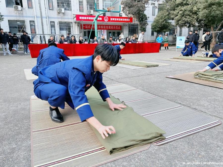 参观考察结束后,消防专业内务比武活动在学校本部11栋前篮球场进行。比赛规则为在规定时间内,运用“叠、压、折、挤、捋、修”等操作技能,完成“棉被”到“豆腐块”的华丽转变。