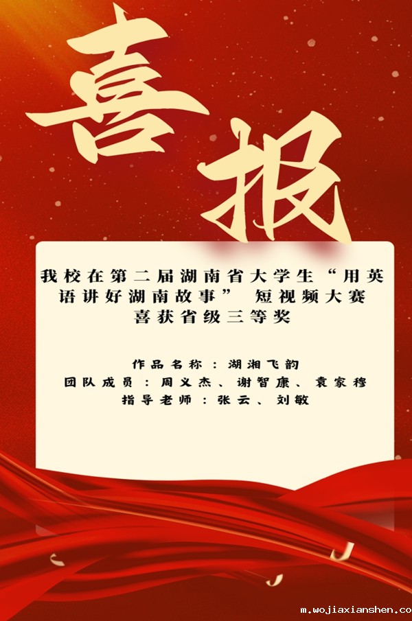 7月15日,第二届湖南省大学生“用英语讲好湖南故事”短视频大赛获奖结果公布,新利luck18(中国)体育推荐作品《湖湘飞韵》获三等奖。