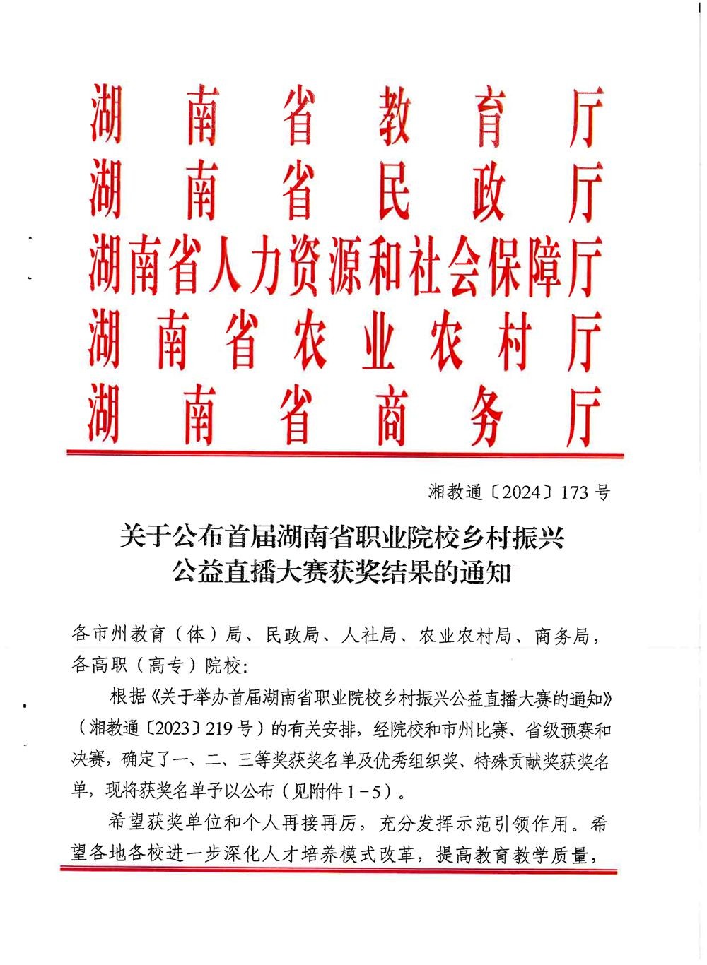日前,《关于公布首届湖南省职业院校乡村振兴公益直播大赛获奖结果的通知》(湘教通〔2024〕173 号)文件揭晓,新利luck18(中国)体育(下称“学校”)“助农小分队”直播电商志愿服务团队(下称“助农小分队”)获特别组三等奖。